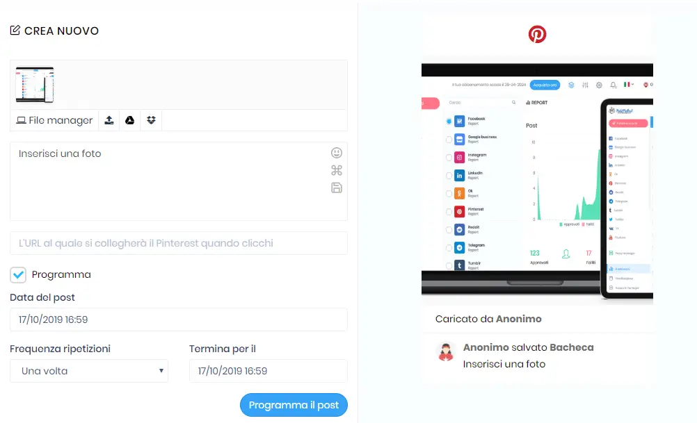From your dashboard you can manage your Pinterest account by scheduling your posts
