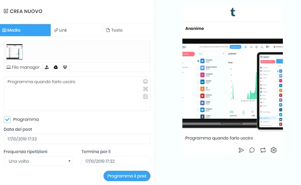 Puoi scegliere se programmare in una data specifica, oppure ripetere lo stesso post fino a 60 giorni.