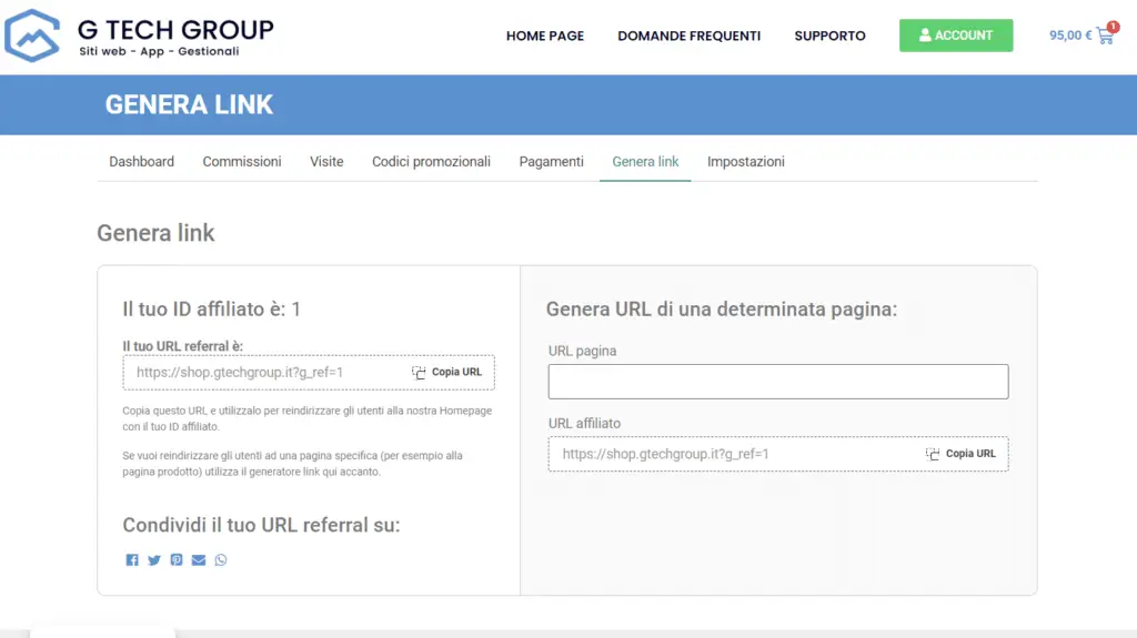 Una volta diventato affiliato, riceverai un link generico che può essere generato dalla pagina https://shop.gtechgroup.it/affiliate-dashboard/generate-link/. In alternativa, è possibile inserire un link dello shop, e il sistema genererà un link di affiliazione dedicato a quella pagina. Utilizza questi link nelle tue strategie di promozione per massimizzare le tue conversioni e guadagnare commissioni.